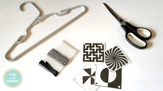 The final activity is based on the same concept as before, but instead of the cards hanging vertically, this time they will lay flat allowing the baby to see them straight on. All you need for this project is a baby hanger, string, scissors, and of course the flashcards. You will need only 3 flashcards with 4 pieces of string for each one. Two of the cards will hang at the same length and the third card will hang lower so make sure to cut the strings accordingly. Now you would tie a string to each hole on the card, then the other ends of those strings you would bundle together with a knot. Then tie this to the hanger with an additional knot. Repeat this process with the 2 additional cards.
